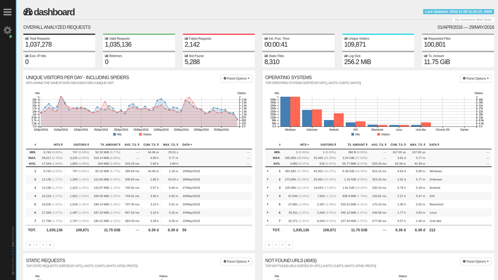 Second, in the upper right-hand corner is the "Last Updated" timestamp. If new data is streaming in, then the Last Updated timestamp should very quickly get updated when a new hit comes in to your server logs.